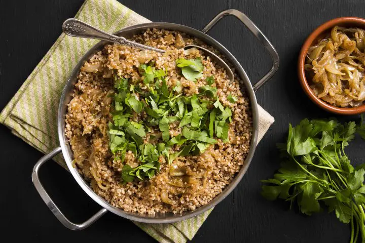 מניחים את הבורגול בקערה ומוסיפים מים רותחים. משהים עד שהבורגול סופג את הנוזלים ומתרכך.