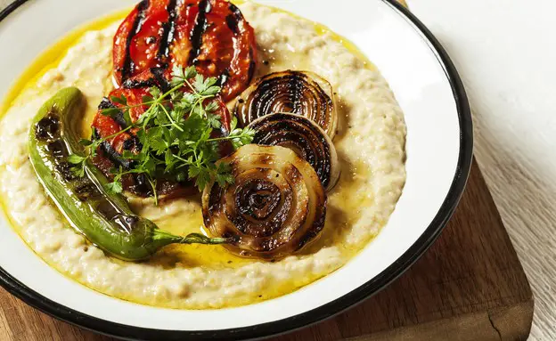 מרכיבים את המנה: מורחים בנדיבות על צלחת עמוקה את החומוס. מניחים עליו את הירקות, מזלפים מעט שמן זית ומגישים מיד.