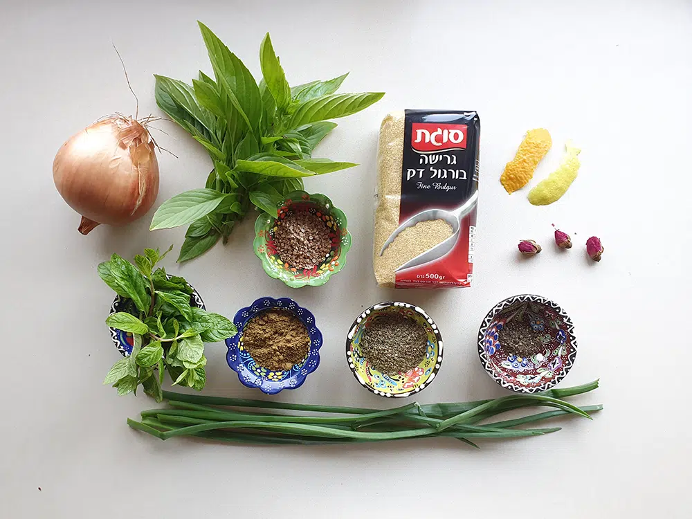 בינתיים מעבירים למעבד מזון את כל חומרי התוספת וטוחנים לקבלת תערובת דקה ואחידה. מעבירים לקערה ומשהים ל-15 דקות לספיגת טעמים ונוזלים.