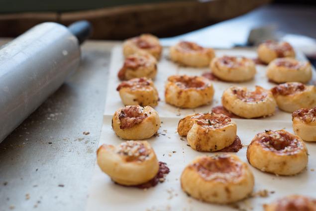 מגלגלים כל רצועה לרולדה ומדביקים את הקצה המוברש בביצה. חותכים את הרולדות לשבלולים בעובי כ-1 ס"מ ומניחים על תבנית מרופדת בנייר אפייה במרווחים של כ-1 ס"מ. מברישים בביצה טרופה ומעטרים בשומשום, אורגנו ומעט מלח.